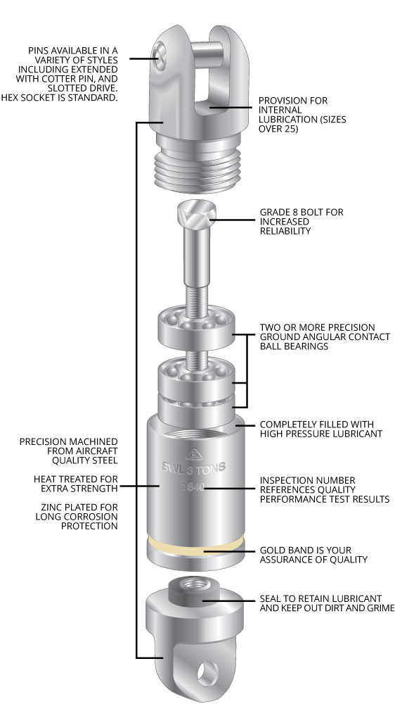 - Each swivel provides an Ultimate Strength that meets or exceeds the listed 5:1 or 3:1 Working Load Limit (WLL).